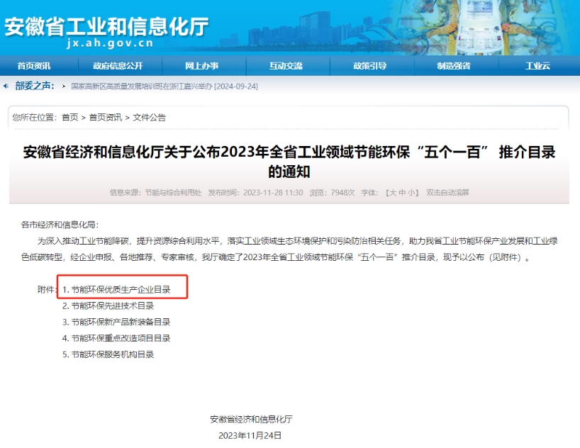 安徽省經(jīng)濟(jì)和信息化廳發(fā)布了《關(guān)于公布2023年全省工業(yè)領(lǐng)域節(jié)能環(huán)保“五個(gè)一百” 推介目錄的通知》,經(jīng)企業(yè)申報(bào)、各地推薦、專(zhuān)家審核,公示環(huán)節(jié)后,我司上榜節(jié)能環(huán)保優(yōu)質(zhì)生產(chǎn)企業(yè)目錄。